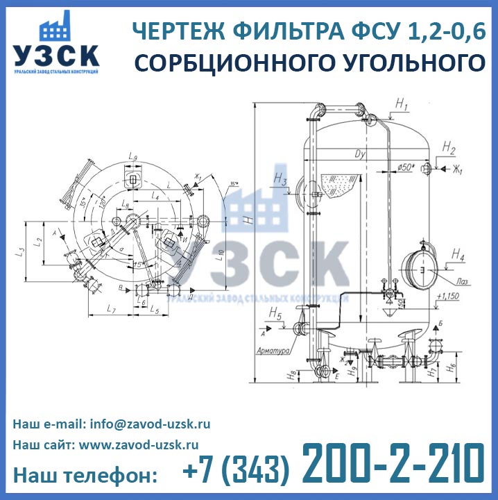 Угольный фильтр ФСУ состоит из следующих конструктивных элементов: цилиндрическая емкость с эллиптическими днищами и люками для осмотра и обслуживания фильтра, НРУ и ВРУ и опоры для монтажа фильтра.